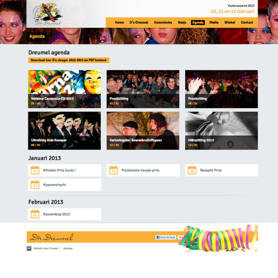 Het grafisch ontwerp van de website sluit perfect aan bij de uitgedragen stijl van de vereniging en het daarbij horende carnavaleske gevoel dat D'n Dreumel oproept. Om de doelgroep nog meer aan te spreken, speelt fotografie een belangrijke rol in het ontwerp. Juist door het gebruik van deze herkenbare beelden heeft de site een uitstraling die past bij de carnavalsvereniging. De website beat een groeiend naslagwerk waarop de liefhebber van de Horster carnavalstraditie o.a. foto's, video's, teksten van alle winnende liedjes en onderscheidingen kan bekijken. De eerste basis hiervan is nu gelegd met deze nieuwe website.
