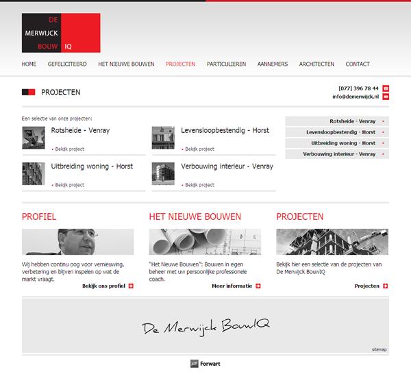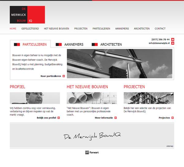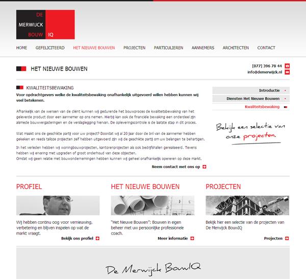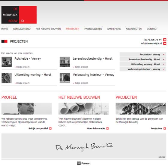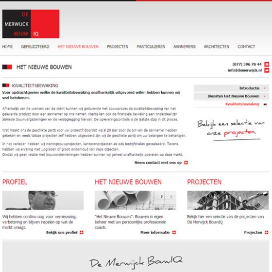 Encore heeft een website gerealiseerd voor De Merwijck BouwIQ. De website bevat diverse informatiepagina’s over de aangeboden diensten en ‘Het Nieuwe Bouwen’, waarbij zoveel mogelijk in eigen beheer wordt gebouwd. De projectenpagina bevat voorbeelden van bouwprojecten die op dit moment bezig zijn en wordt later aangevuld met foto’s van het eindresultaat.