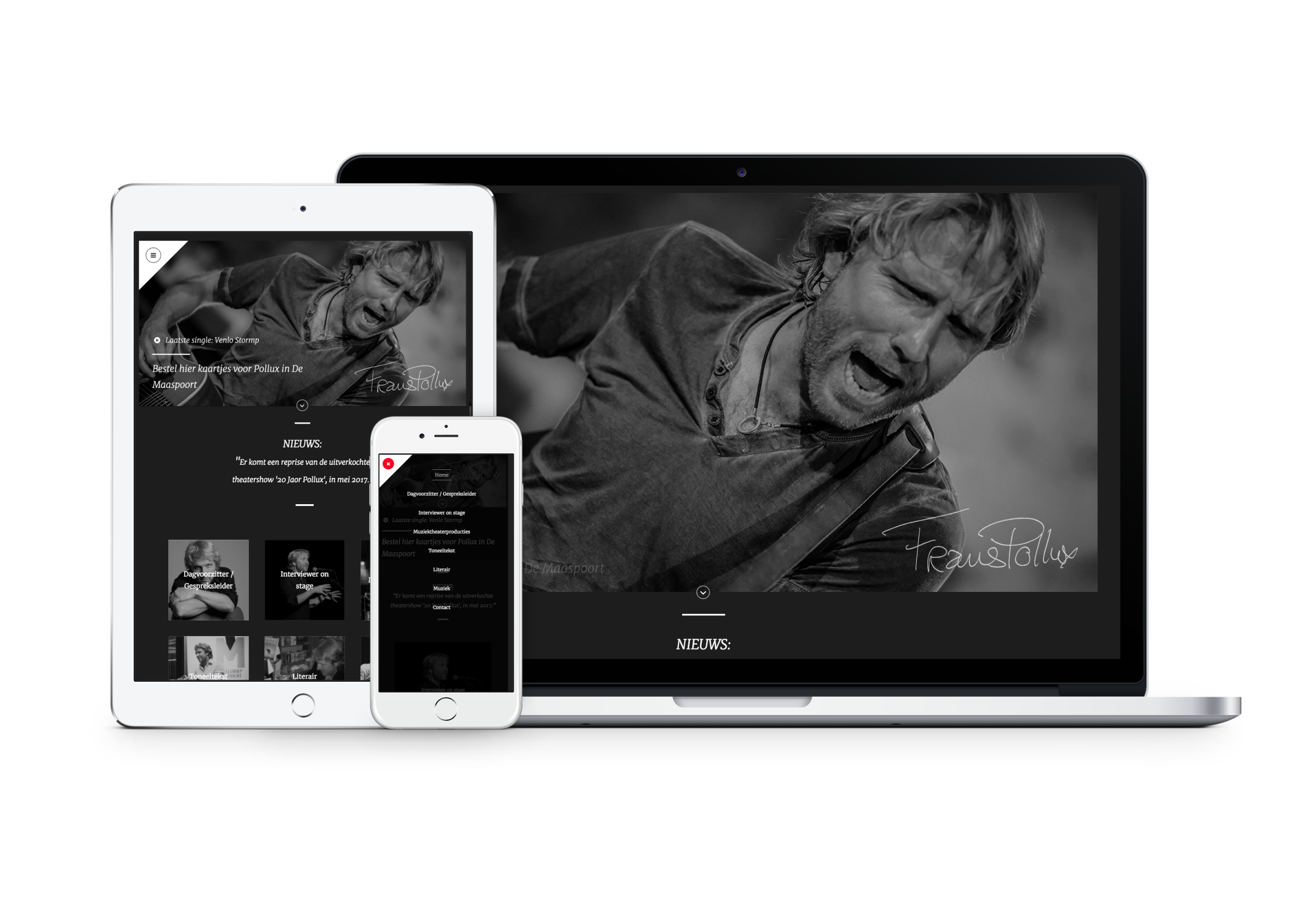 Encore heeft voor de Venlosche schrijver, muzikant en presentator Frans Pollux een nieuwe website gerealiseerd. De website is voorzien van een uniek grafisch ontwerp dat volledig in zwart/wit is opgezet. Hierdoor worden op stijlvolle en eigenzinnige wijze de belangrijkste informatie en disciplines van Frans Pollux gepresenteerd.