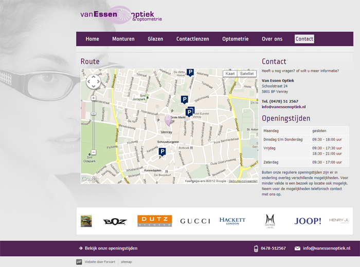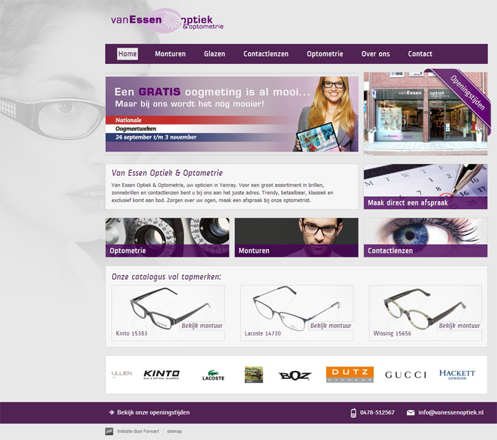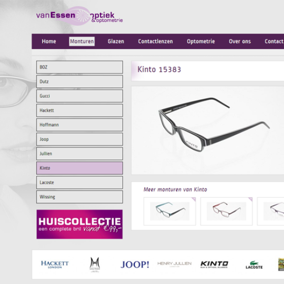 Internetbureau Encore heeft een nieuwe website gerealiseerd voor Van Essen. De nieuwe website bevat interessante informatie voor bestaande en potentiële klanten in regio Venray. Een deel van hun uitgebreide collectie monturen wordt op de website gepresenteerd. Bezoekers kunnen bladeren door alle monturen, of hun favoriete merk kiezen om de topmodellen van dat merk te bekijken. De monturen zijn gedetailleerd te bekijken door het gebruik van een 360 graden fotomodule waarmee een bezoeker het montuur zelf kan draaien om zodoende alle kanten van het montuur te bekijken. Bij interesse kan een bezoeker het montuur direct reserveren via de website. Op een zelf te kiezen datum en dagdeel, kan de bezoeker het montuur vrijblijvend passen in de winkel. Hiermee wordt een website bezoek concreet omgezet naar een bezoek aan de fysieke winkel.