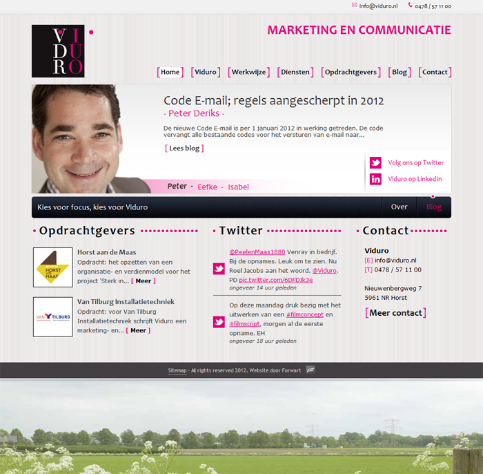 Viduro is een gedreven en strategisch sterk bureau in marketing en communicatie uit Horst. Eigenaar Peter Deriks liet al in 2007 een website realiseren bij Internetbureau Encore. Deze website werd in 2009 volledig aangepast zodat deze ingezet kon worden voor Viduro. Om te profiteren van diverse moderne toepassingen, is de website (die inmiddels 5 jaar oud was) nu overgezet naar een nieuwer systeem. Dit systeem sluit beter aan bij de verwachtingen van de opdrachtgever en omdat dit systeem geschikt is voor meerdere websites, kan Viduro met hetzelfde systeem ook websites van hun opdrachtgevers aanpassen.