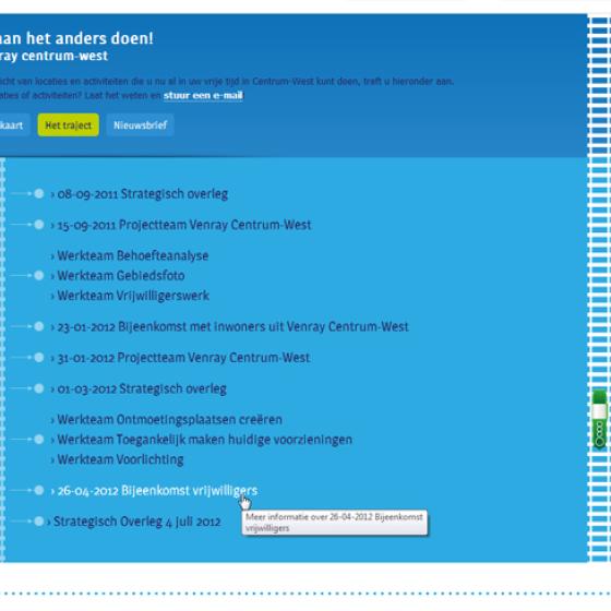 De website bevat voor beide trajecten een kaart waarop alle activiteiten te zien zijn. Bovendien geeft een tijdlijn inzicht in het traject. Via het forum kunnen website bezoekers reageren en discussiëren. Daarnaast bevat de website actuele berichten en een nieuwsbrief waarmee deelnemers automatisch op de hoogte blijven van nieuwe activiteiten.