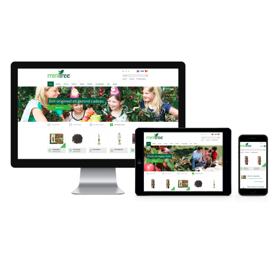 Het professionele ontwerp van de webshop sluit perfect aan bij de gewenste uitstraling van MiniTree. Het aanbod van fruitboomjes en aanverwante producten wordt uitgebreid gepresenteerd op de website met informatieve teksten en professionele fotografie. De webshop is uitgerust met moderne technieken en voorzien van een responsive webshop ontwerp. Hierdoor werkt deze multi-screen site op elk scherm en apparaat perfect. Een analyse van webstatistieken bevestigt het nut van een responsive ontwerp. Bijna de helft van het totale aantal bezoekers heeft de website reeds via een smartphone of tablet bezocht. Een responsive webshop leent zich perfect voor zowel de oriëntatie als aankoop van producten. Encore is specialist in de ontwikkeling van responsive webshops.