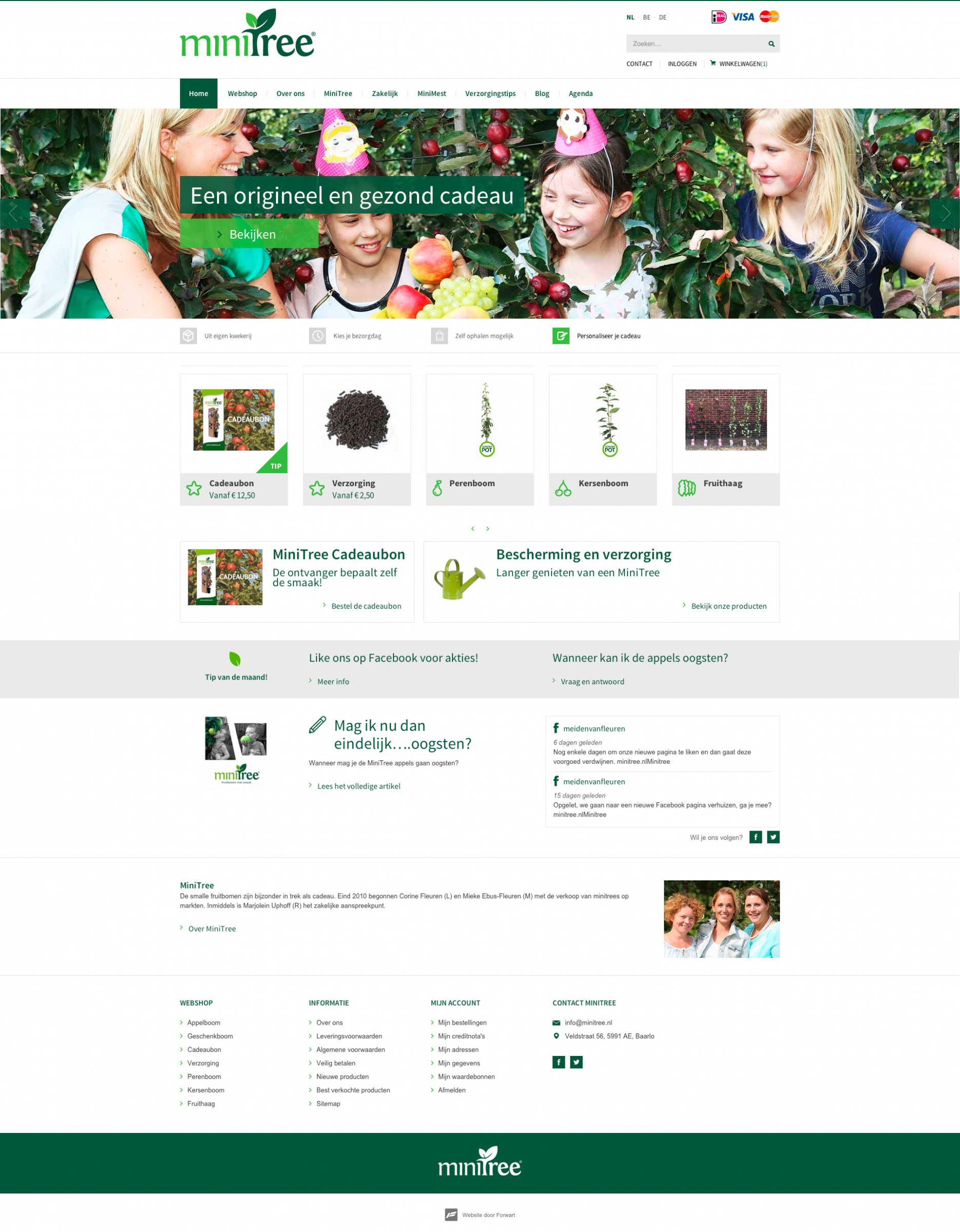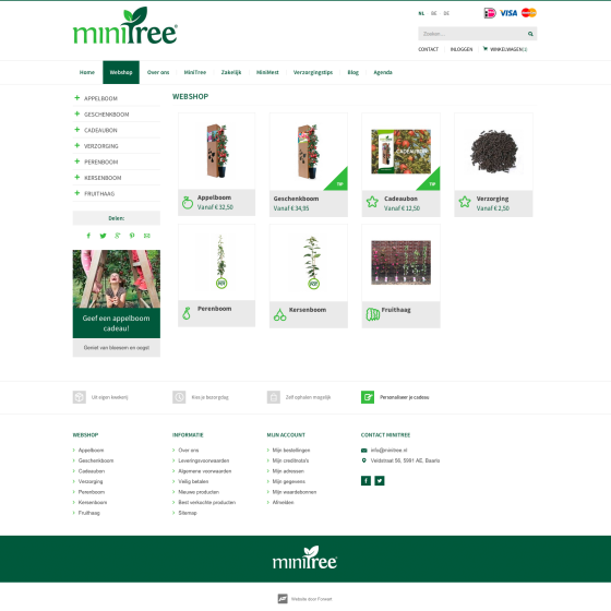 MiniTree is uitvinder en leverancier van kleine fruitbomen. De boompjes in cadeauverpakking zijn leuk voor particulieren en lenen zich bovendien perfect als (relatie-) geschenk. Naast de verkoop van de verschillende soorten fruitbomen levert het bedrijf een assortiment van bijhorende verzorgingsproducten. Encore heeft voor het in Baarlo gevestigde MiniTree een volledig nieuwe webshop realiseerd.