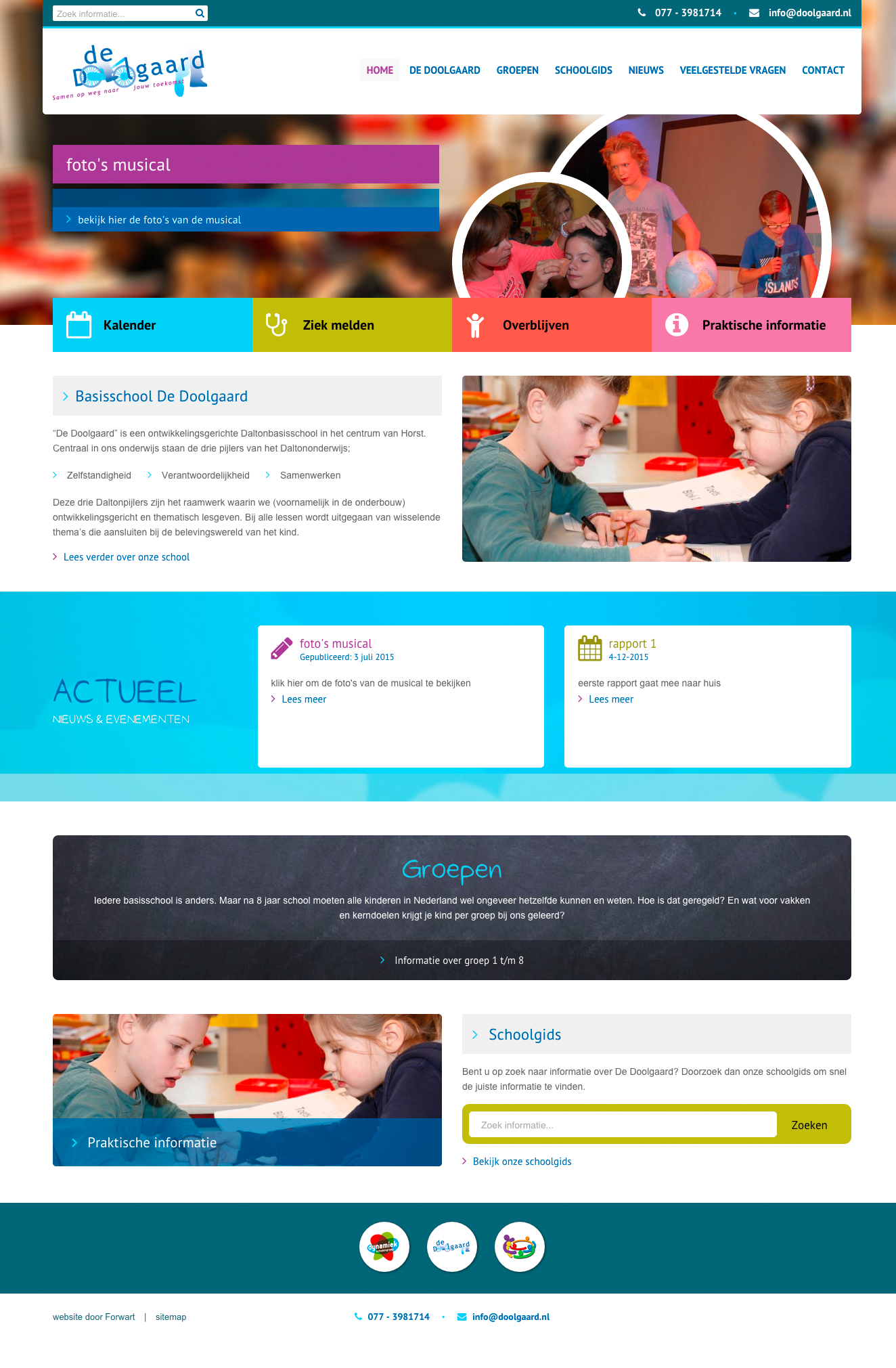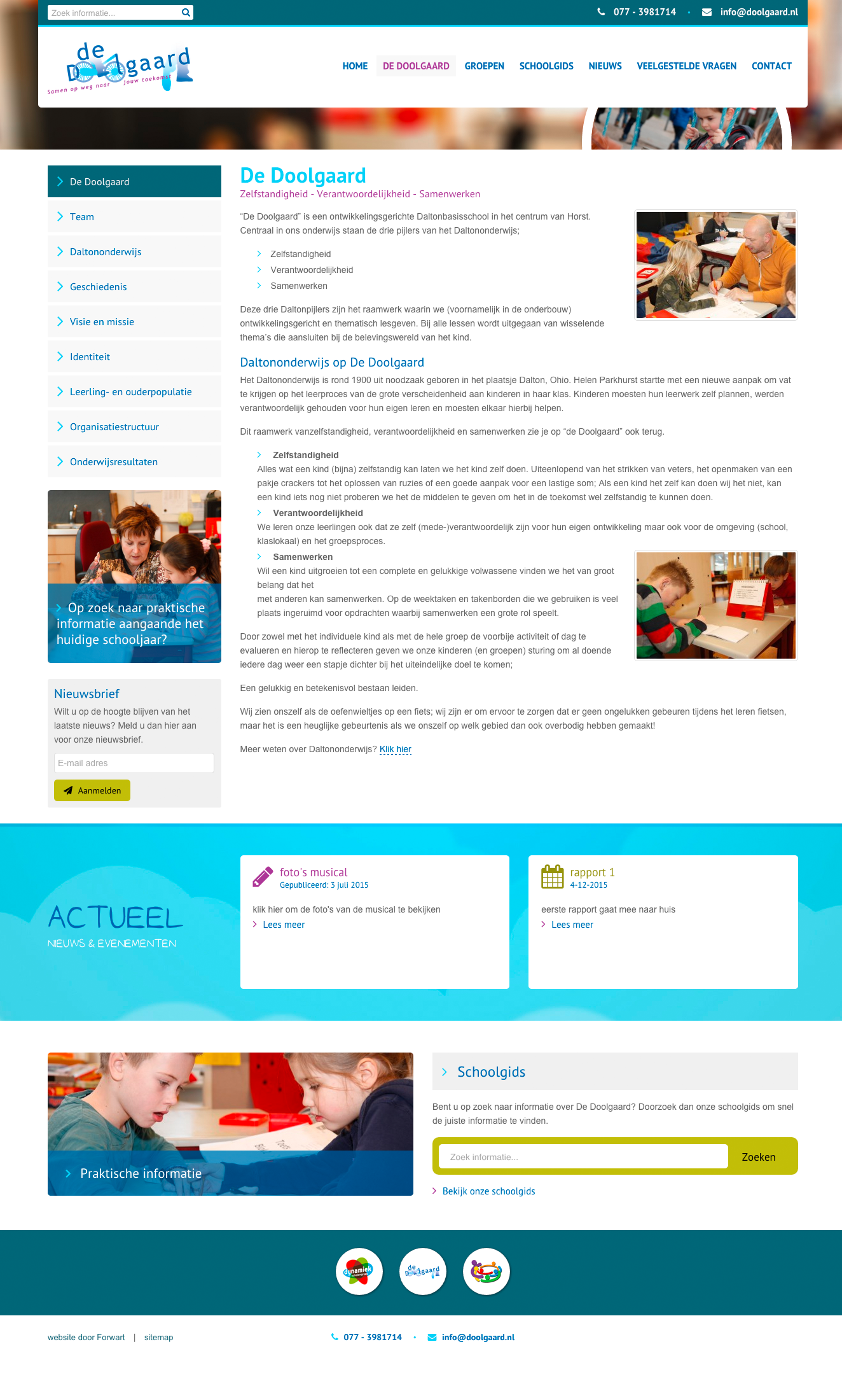 Encore heeft een nieuwe website voor De Doolgaard gerealiseerd met uitgebreide informatie over de school, het team, en het onderwijs. Daarnaast is de schoolgids volledig gedigitaliseerd en zijn alle veelgestelde vragen gebundeld waardoor de grote hoeveelheid aan informatie overzichtelijk wordt gepresenteerd en snel te raadplegen is. Bovendien is het beheersysteem van de website uitgerust met een formulierenbouwer waardoor de medewerkers van de school zelf uitgebreide formulieren kunnen opzetten en beheren. Zo zijn er formulieren waarmee ouders hun kind kunnen ziekmelden of aanmelden voor tussenschoolseopvang. Deze automatisering ontzorgt zowel de ouders als de teamleden van De Doolgaard.