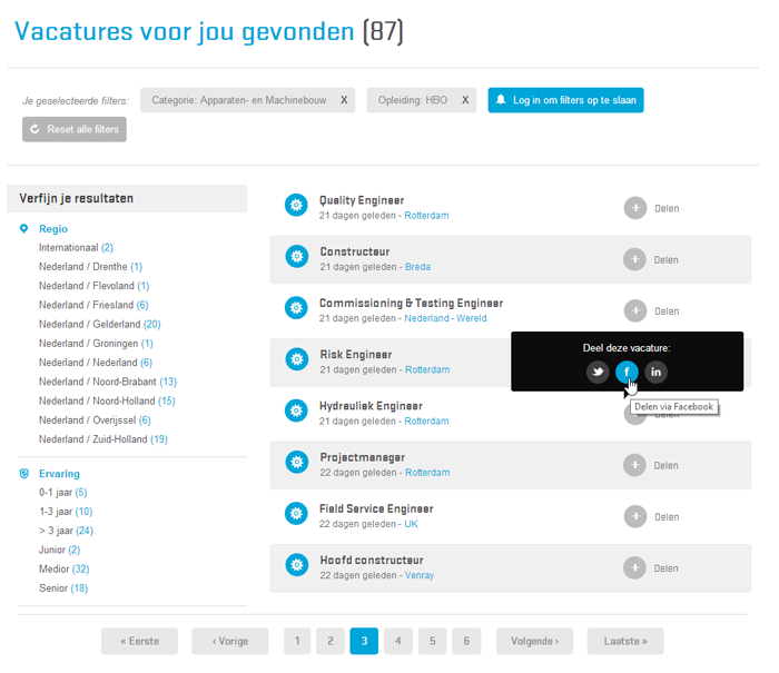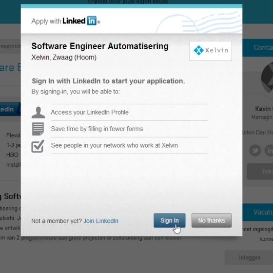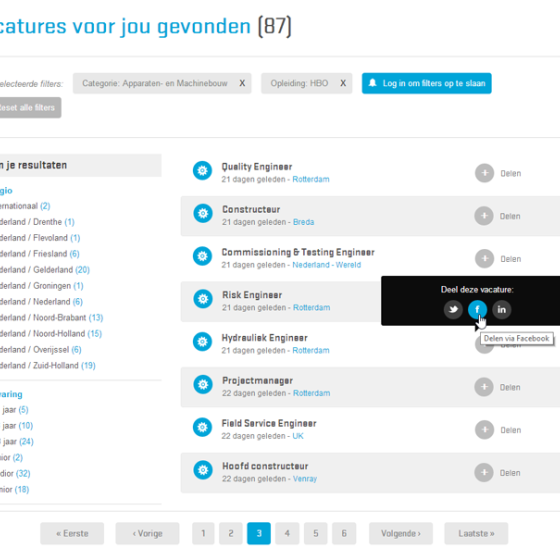 - Kandidaten hebben een persoonlijke login waarin zij hun eigen e-mail alerts kunnen aanmaken voor de vacatures. Inloggen is mogelijk via Facebook, LinkedIn, Twitter of via een Xelvin account.