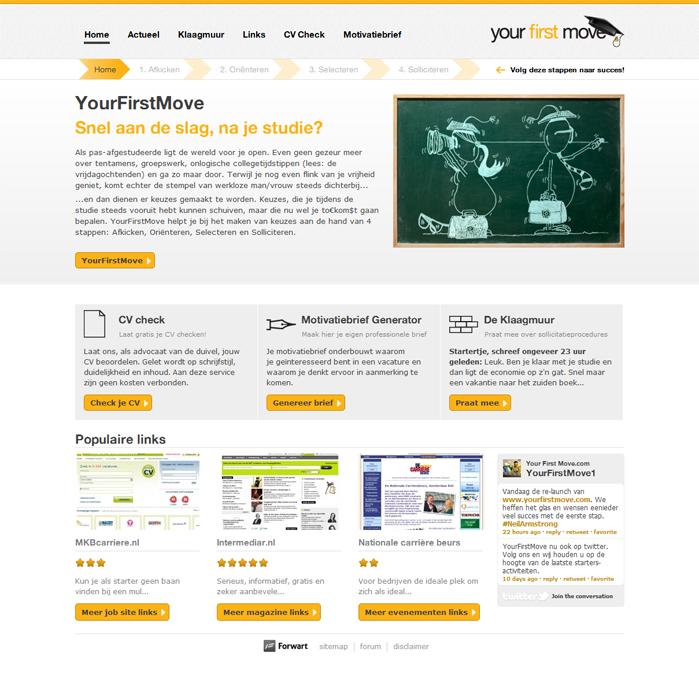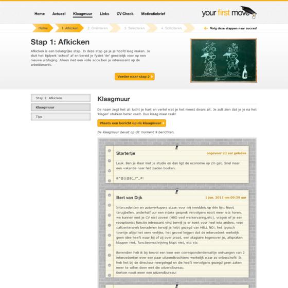 YourFirstMove is een ontmoetingsplaats voor starters, pas afgestudeerden en werkzoekenden. Deze website helpt hen bij het maken van keuzes aan de hand van 4 stappen: Afkicken, Oriënteren, Selecteren en Solliciteren.