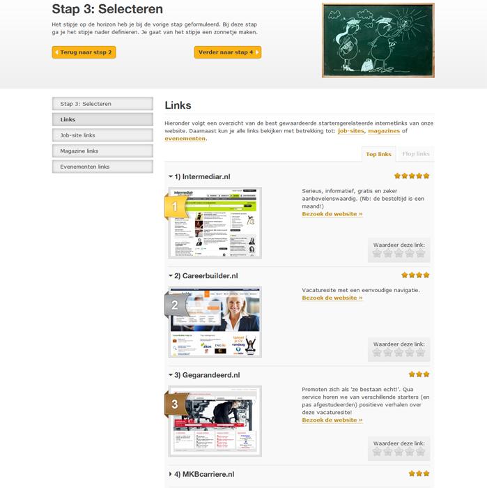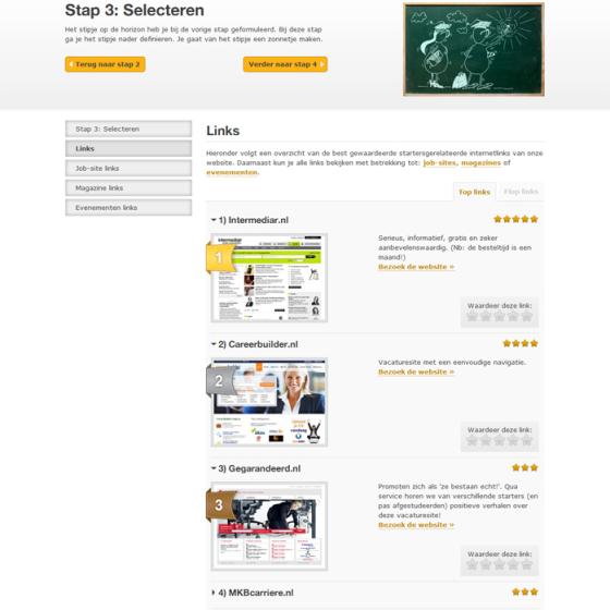 De website bevat tevens een overzicht met links. Website bezoekers kunnen zelf hun stem uitbrengen op een website zodat een lijst met top-sites en flop-sites ontstaat. De lijst wordt aantrekkelijk gepresenteerd met voorbeeld afbeeldingen van de websites. Frustraties over sollicitaties kunnen geuit worden op de klaagmuur waarop de berichten in stijl worden weergegeven. Daarnaast is de website uitgerust met een pagina voor actualiteiten en evenementen.