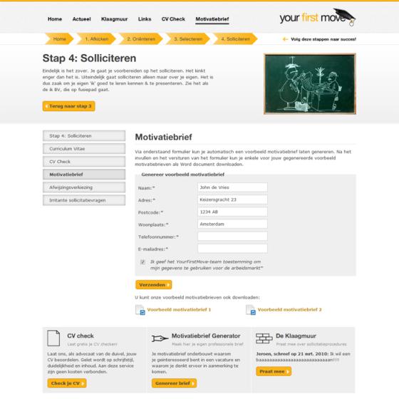 Encore heeft een nieuwe website en modern logo gerealiseerd voor YourFirstMove. De vormgeving van de website legt sterk de focus op de inhoud. De vier stappen komen prominent terug in het ontwerp en elke stap is voorzien van een ludieke tekening. In de verschillende stappen kan een bezoeker niet alleen informatie lezen, maar ook gebruik maken van diverse online tools. Via een CV-check kan een bezoeker een CV uploaden waarna die wordt gecontroleerd door het team achter YourFirstMove. Tevens bevat de website een aantal voorbeelden van CV’s en motivatiebrieven. Door het invullen van de persoonlijke gegevens op de website kan de bezoeker direct een gepersonaliseerd Word bestand met motivatiebrief en CV downloaden.