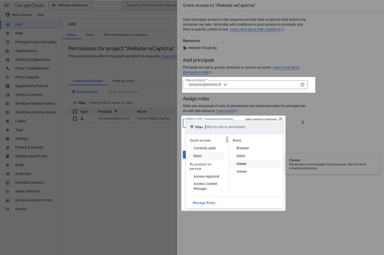 - Bij 'Select a role' kies je onder Quick access, voor Basic en vervolgens voor Owner.