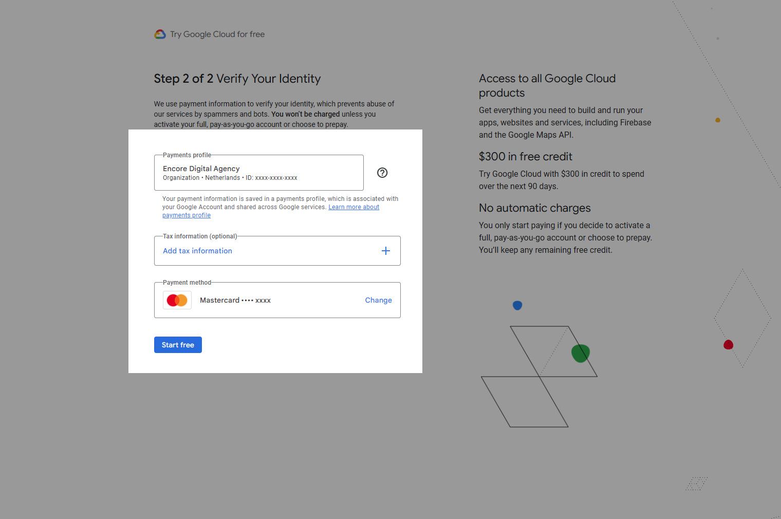 Google Cloud Console vereist een gekoppeld billing account. Als je al een billing account hebt mag je deze stap overslaan.