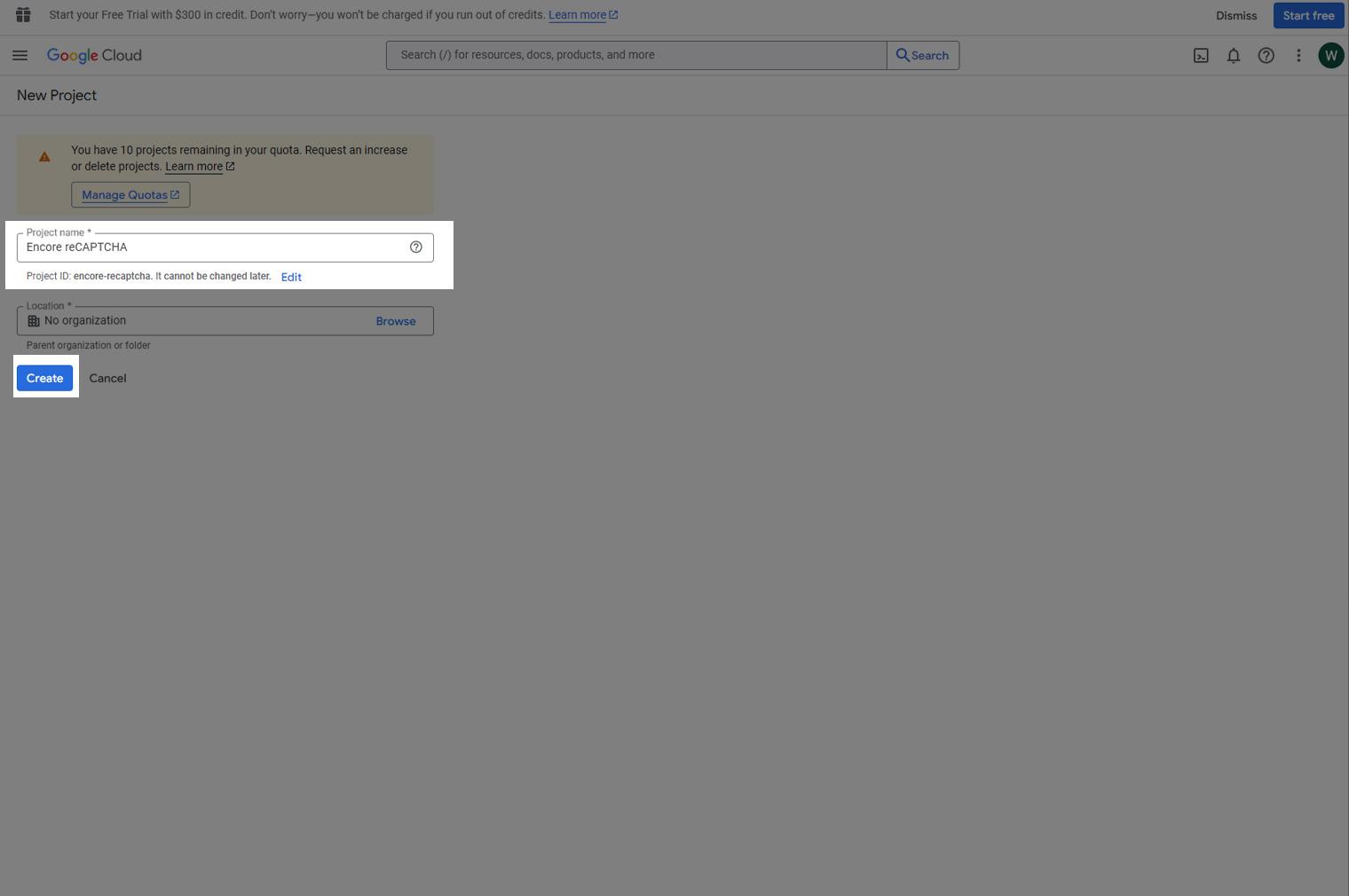 - Geef je project een duidelijke naam, bijvoorbeeld Websitenaam Cloud Console.