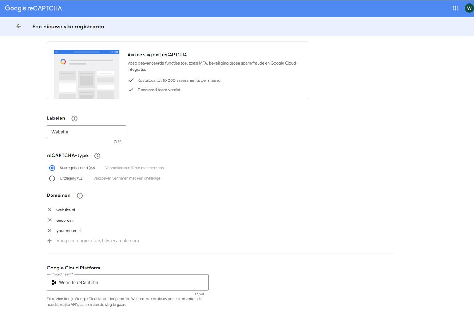 - Geef je project een duidelijke naam, bijvoorbeeld Websitenaam reCAPTCHA.